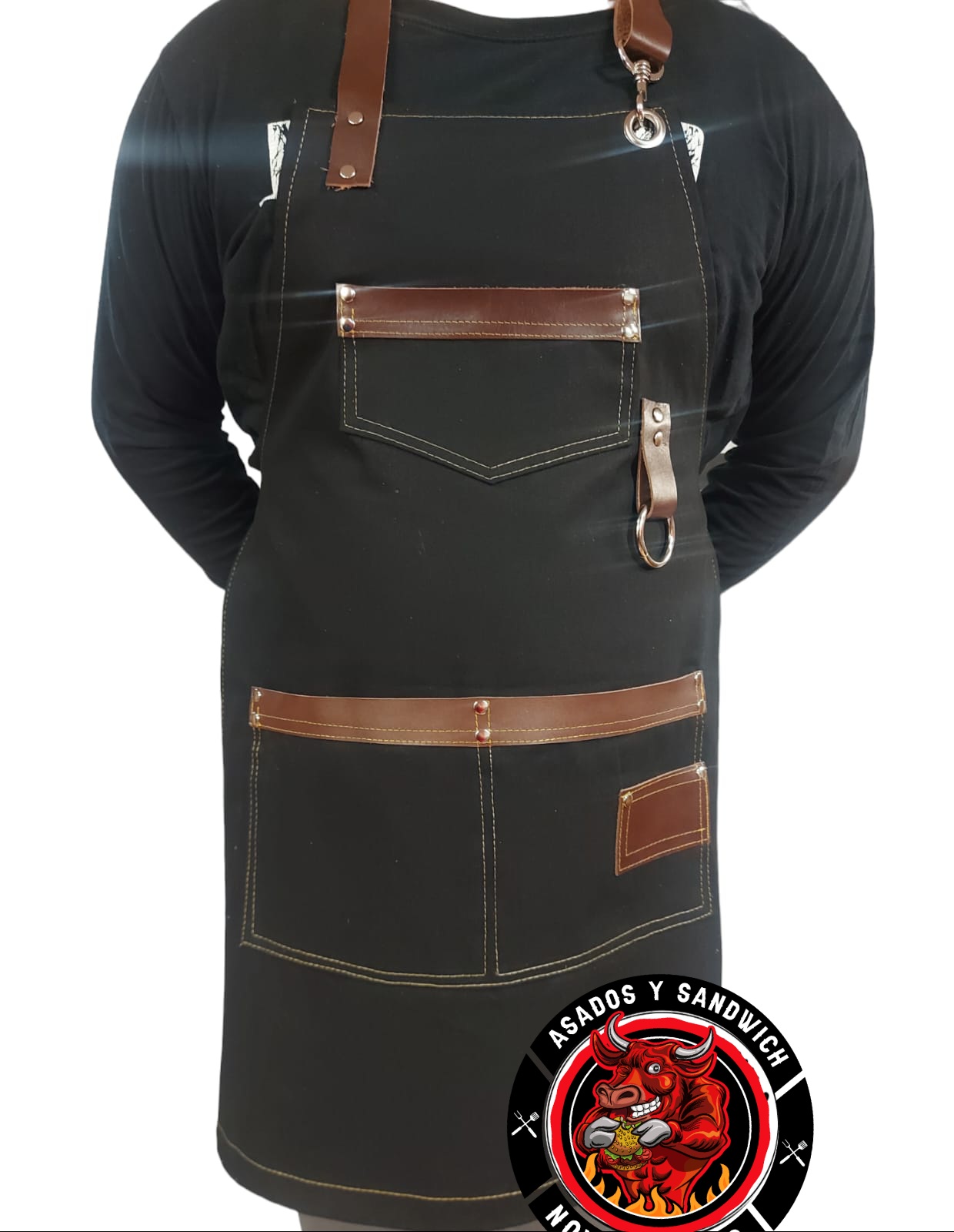 Hermosa y practica pechera con enchapes de cuero sobre una tela resistente y lavable.